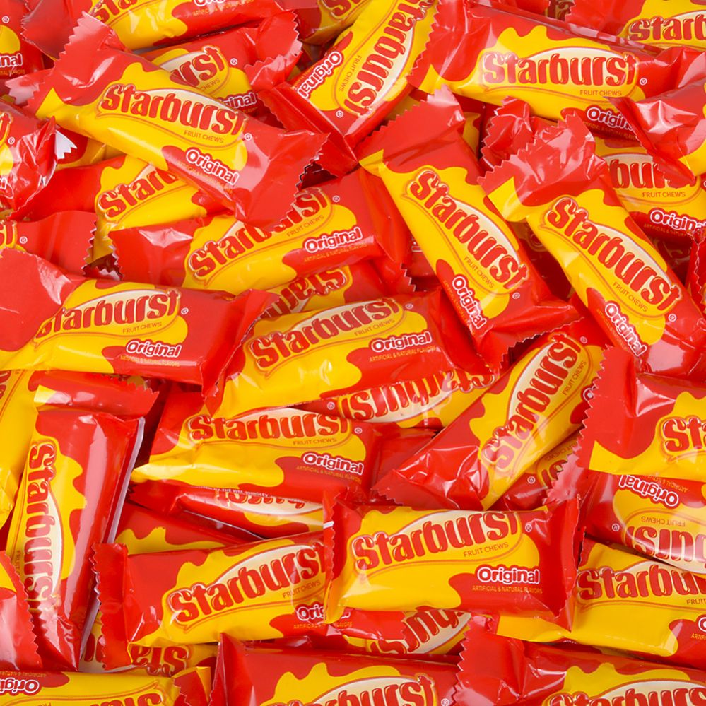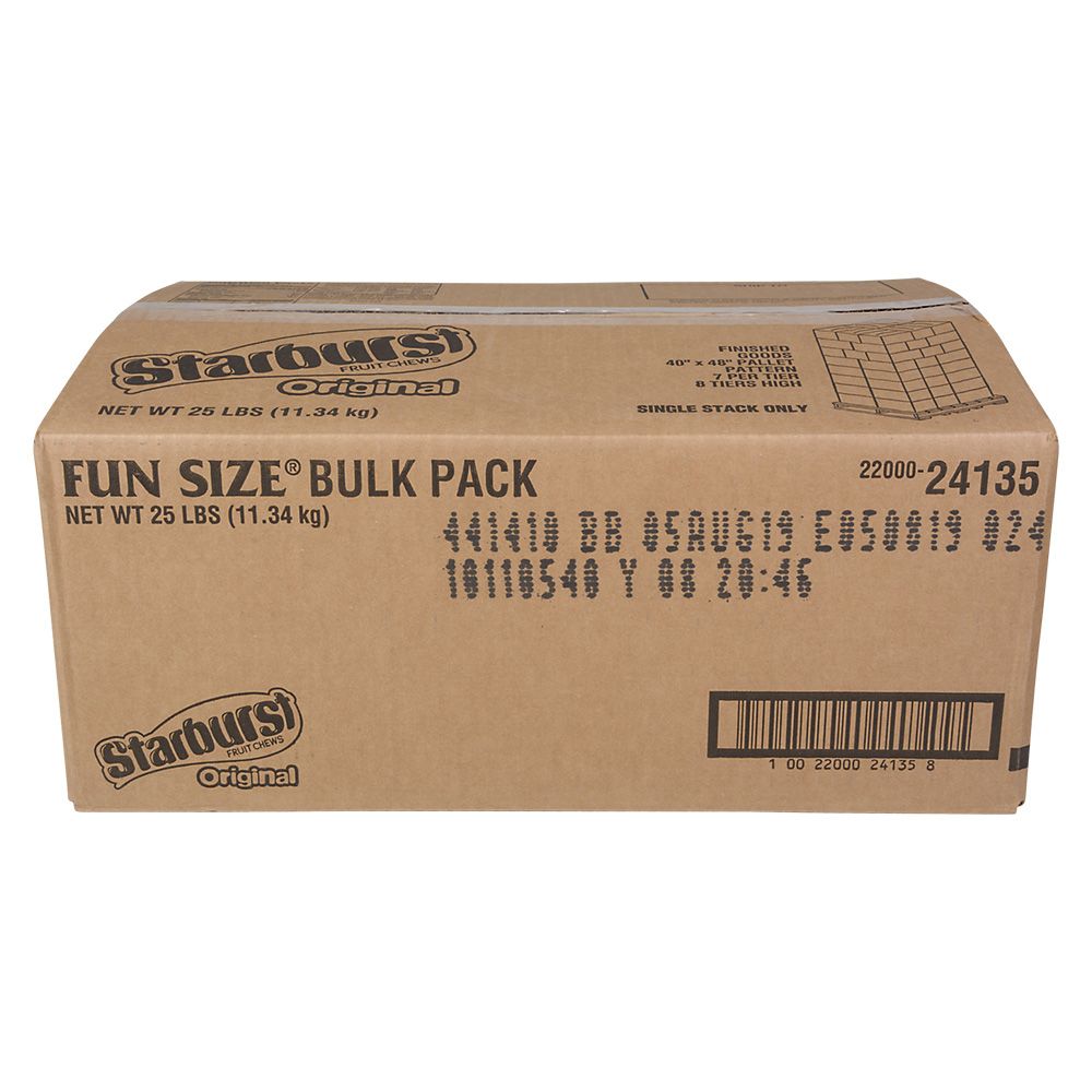 Add to WishlistEnjoy the classic, chewy goodness of Starburst with this bulk case of 1135 fun-size pieces. Featuring the original fruity flavors?strawberry, cherry, orange, and lemon?these individually wrapped candies are perfect for parties, events, and candy buffets. Great for sharing, snacking, or filling treat bags.