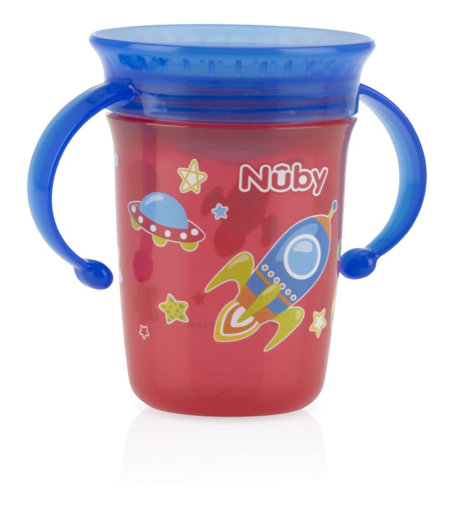 Features: 360-degree drinking rim, no-spill silicone valve, two easy-grip handles, assorted printed designs