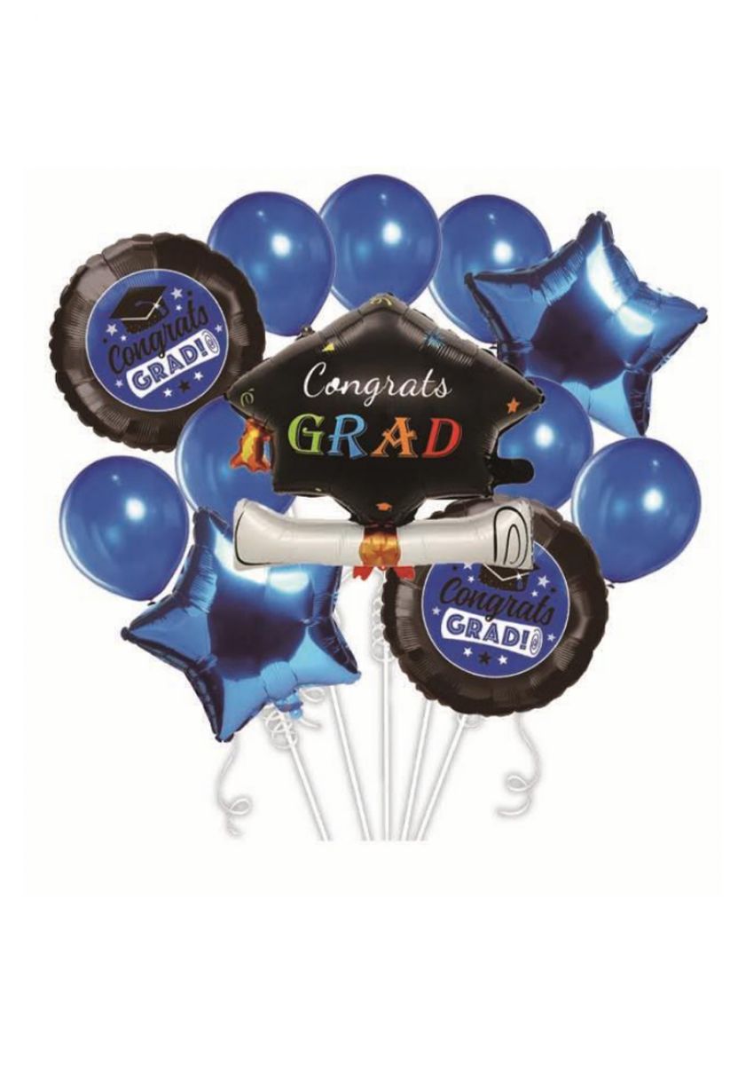 Celebrate graduation in style with the 12pc Graduation Balloon Kit, featuring a 60 x 61 cm giant printed foil balloon, seven 12" pearl blue balloons, two 18" blue star-shaped foil balloons, and two 18" printed round foil balloons. Crafted from premium-quality foil, this set includes a 5m ribbon and straw for easy inflation. The self-seal and refillable design ensures long-lasting enjoyment, making it a perfect addition to any graduation celebration.