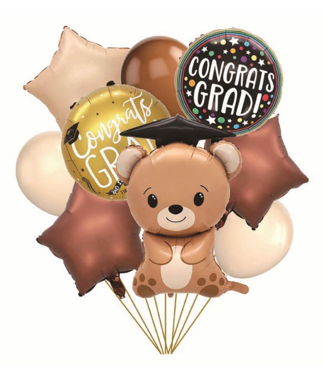 Celebrate graduation in style with the 9pc Graduation Balloon Kit, featuring a giant printed foil balloon (55 x 74 cm), three 12" round balloons, three 18" star-shaped foil balloons, and two 18" printed round foil balloons. This premium-quality set includes a 5m brown ribbon and a straw for easy inflation. Designed for convenience, the self-seal and refillable balloons make decorating effortless and fun.