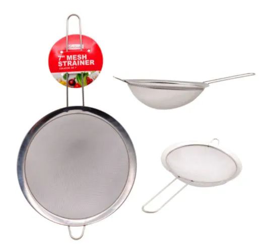 Add to WishlistThis stainless steel mesh strainer features a 7-inch handle and a hoop for easy hanging. Its durable, silver-toned design is perfect for straining, rinsing, and sifting in the kitchen.