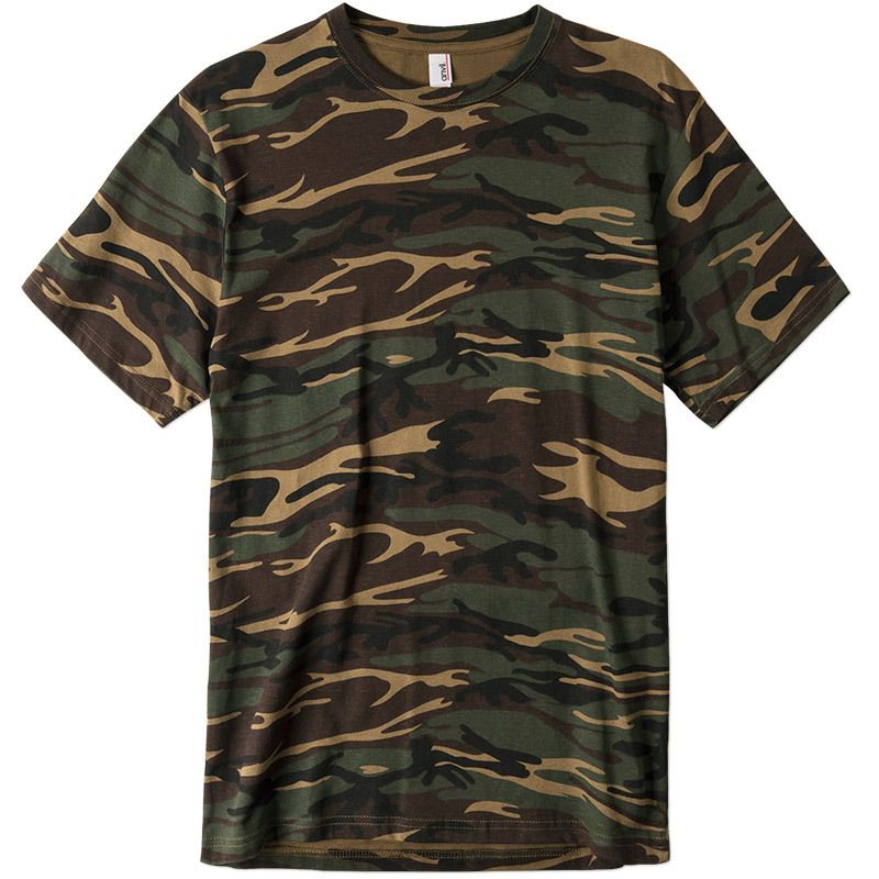 Men’s green camo short-sleeve tee shirts, made from a soft and durable cotton-poly blend. Perfect for everyday wear, donations, uniforms, or outdoor activities.